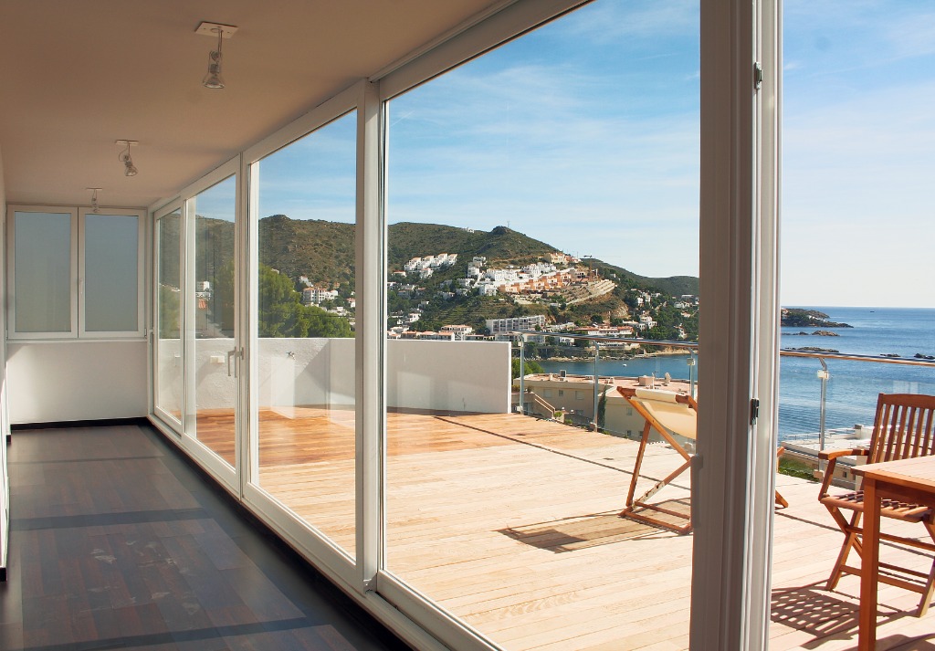 Minimal çerçeve tasarımlı geniş camlı sürme sistem. Modern villa projesi için özel tasarım.
